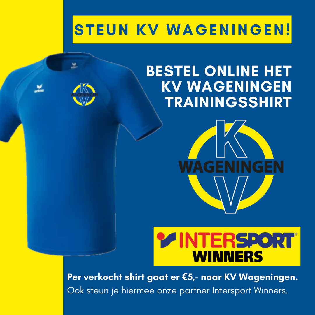 Er zijn nieuwe KV Wageningen trainingsshirts! Wanneer je dit shirt nu bestelt, sla je twee vliegen in een klap: je steunt KV Wageningen en je steunt onze partner en lokale ondernemer Intersport Winners. De trainingsshirts, met KV Wageningen logo, kosten €18 Euro, waarvan €5 Euro naar de club gaat. Voor €10 Euro extra kun je je naam er op laten drukken.