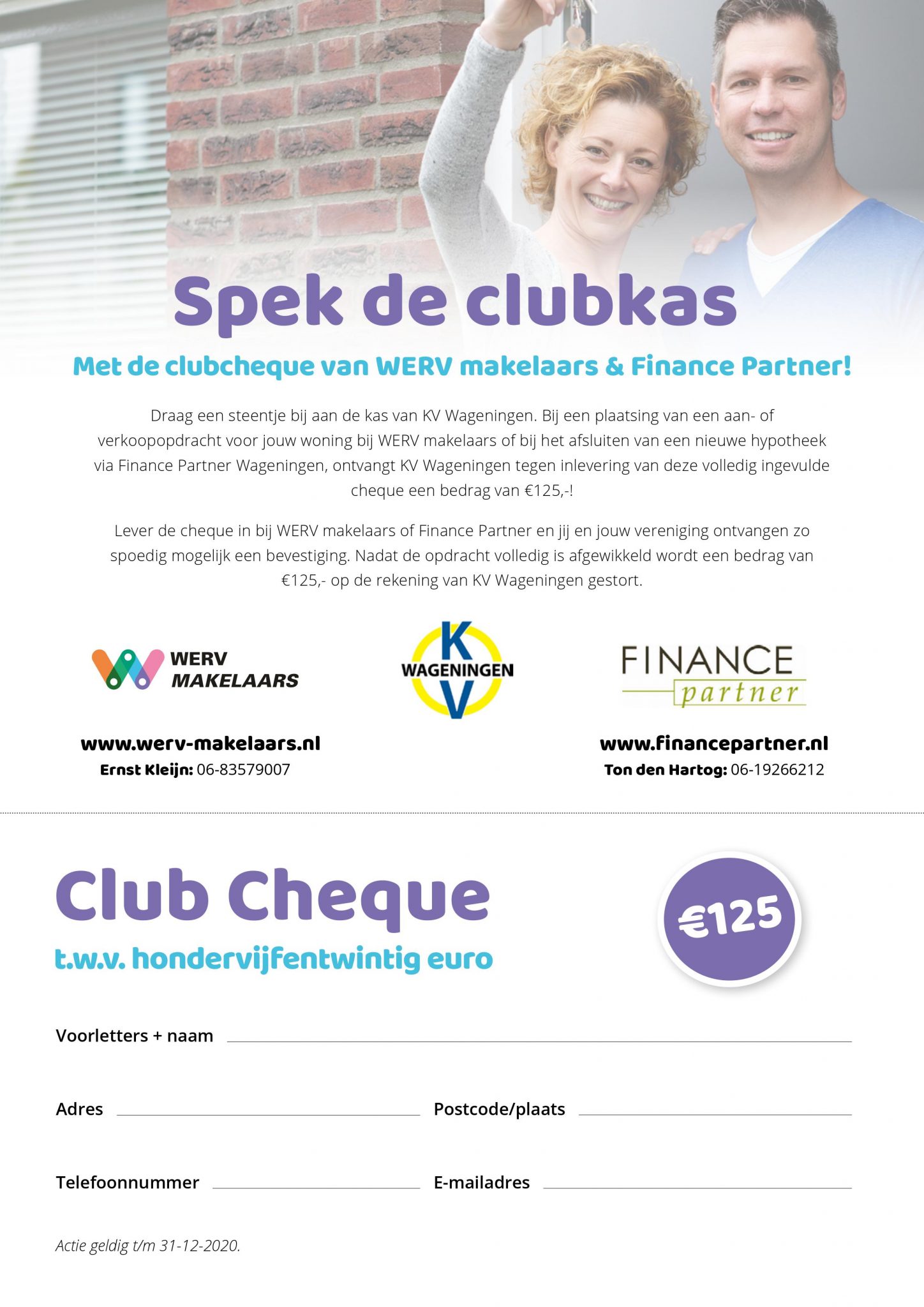 Bij de plaatsing van een aan- of verkoopopdracht voor een woning bij WERV Makelaars of bij het afsluiten van een nieuwe hypotheek via Finance Partner Wageningen, ontvangt KV Wageningen tegen inlevering van deze volledig ingevulde cheque een bedrag van €125,-