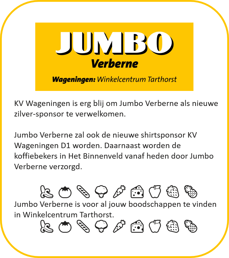 Jumbo Verberne is niet alleen een nieuwe zilver-sponsor, maar zal ook de nieuwe shirtsponsor van Wageningen D1 zijn. Verder worden de koffiebekers in Het Binnenveld vanaf heden verzorgd door Jumbo Verberne uit Winkelcentrum Tarthorst.