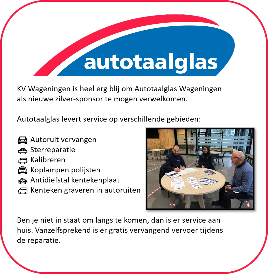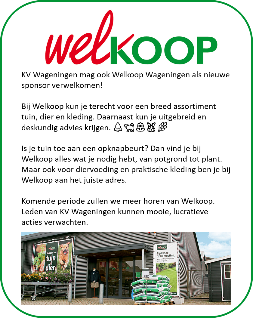 Welkoop Wageningen is ook een nieuwe sponsor. We gaan meer horen van Welkoop Wageningen want we kunnen mooie, lucratieve acties verwachten voor onze leden.