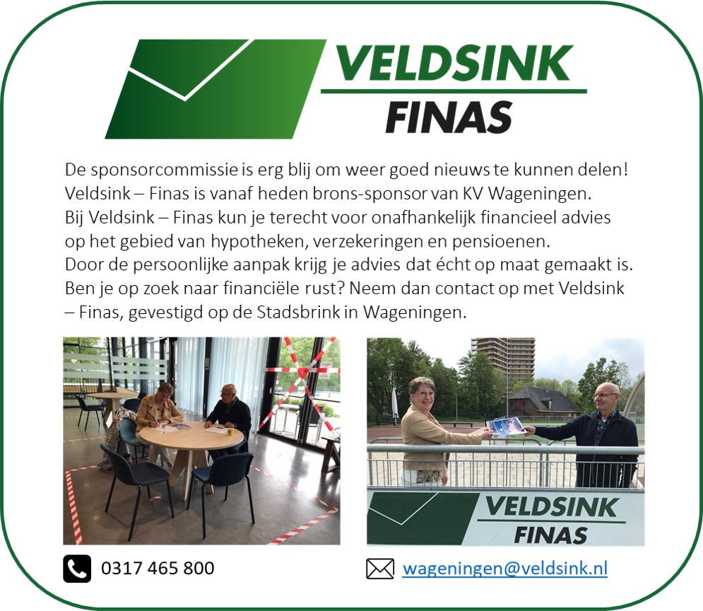 De sponsorcommissie is erg blij om weer goed nieuws te kunnen delen! Veldsink - Finas is vanaf heden brons-sponsor van KV Wageningen. Bij Veldsink - Finas kun je terecht voor onafhankelijk financieel advies op het gebied van hypotheken, verzekeringen en pensioenen. Door de persoonlijke aandacht krijg je advies dat écht op maat gemaakt is. Ben je op zoek naar financiële rust? Neem dan contact op met Veldsink - Finas, gevestigd op de Stadsbrink in Wageningen.